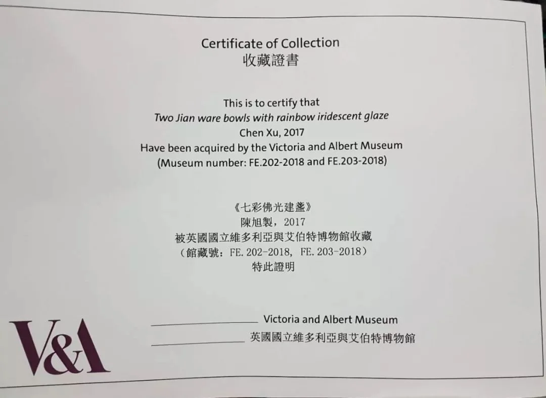 今天,V&A拥有由古至今各个年代来自世界各地的顶级精选,藏品总数达两百多万件。V&A收藏了五千多年前的中国古代陶瓷,也非常希望收藏中国当代瓷器作品,陈旭的七彩佛光盏脱胎于宋代建窑建盏,又以独特的釉色显示出当代的创新风格,因而,陈旭的七彩佛光盏被V&A视为21世纪的建盏精品,作为21世界的代表作品进行永久收藏。