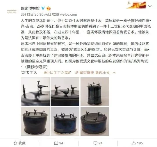 尚吉雷作品在中国国家博物馆展出 尚吉雷(Jean Girel ) 的作品正在中国国家博物馆展出,延展到5月4日。他受滇文化中铜鼓的启发创作出天目釉“鼓”系列的陶瓷。以下为中国国家博物馆的微博正文。滇文化:滇文化是战国中后期至西汉末,以滇池为中心,东达曲靖,西对禄丰,北迤东川,南抵通海、华宁这一大致范围分布着一支高度发达的青铜文化,这便是考古学称这为“滇文化”的边疆少数民族文化——一种古老 、神秘 、灿烂、辉煌的文化。 图为国家博物馆微博正文 TK NgiamJune 21, 2019 Facebook0 Twitter LinkedIn0 Reddit Tumblr 0 Likes