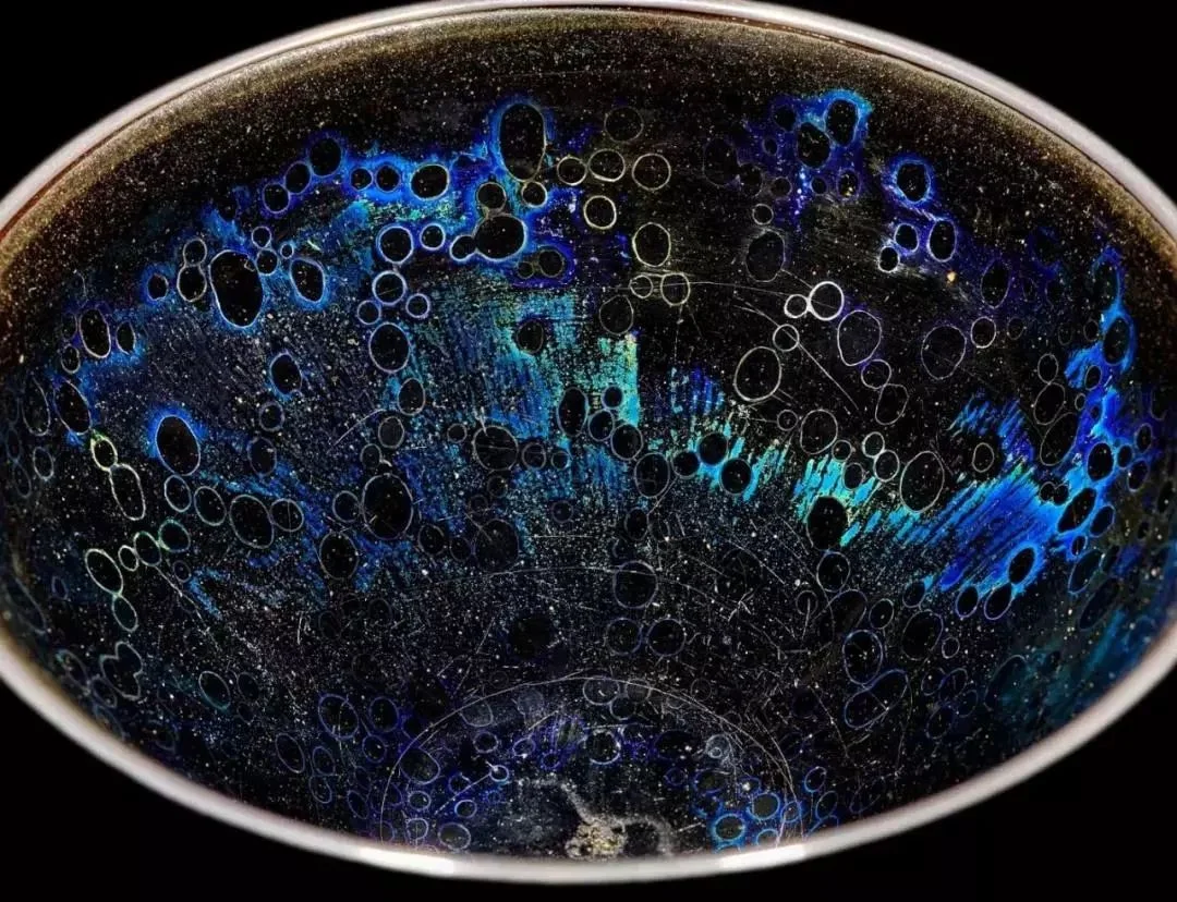 静嘉堂曜变天目的实物,远比视频和图片中的还要奇幻斑斓。与图片和视频不同,曜变天目釉面内的圈纹,并不只是蓝色,很多是由黄红蓝构成的彩环。色彩受光线影响很大,不同状态下就有不同的色泽,因而很难欣赏到它所有的形态。