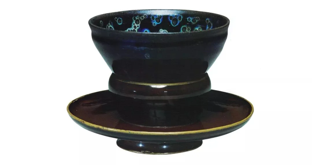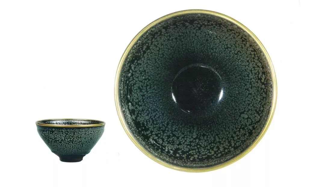 油滴建盏在当代建盏中很多,但是宋代流传下来的油滴建盏整器却是极少。大阪市东洋陶瓷美术馆的国宝油滴应该是世界上最好的油滴建盏,它黑底银斑,灵动而不失沉稳,如同神秘地带里闪烁的非凡的洞察力。此外,它的口沿还有金扣,显示出精湛的锔瓷工艺。